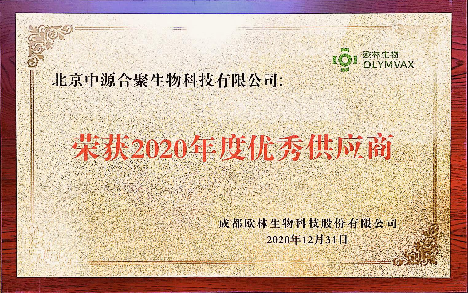 喜讯 | 中源公司荣获欧林生物2020年度优秀供应商