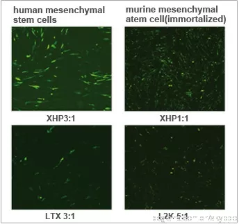图3. X-tremeGENE HP对难转细胞系的转染效果优于脂质体转染方法。应用GFP编码的质粒对人/鼠间充质干细胞进行转染。XHP 3:1表示用X-tremeGENE HP及相应的转染试剂(μl): 质粒DNA (μg)比例进行转染(图片来源于网络)。