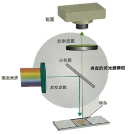 多色荧光显微镜。典型的免疫荧光设置包括光源、适合目的荧光染料的滤光片组合,以及检测机制。