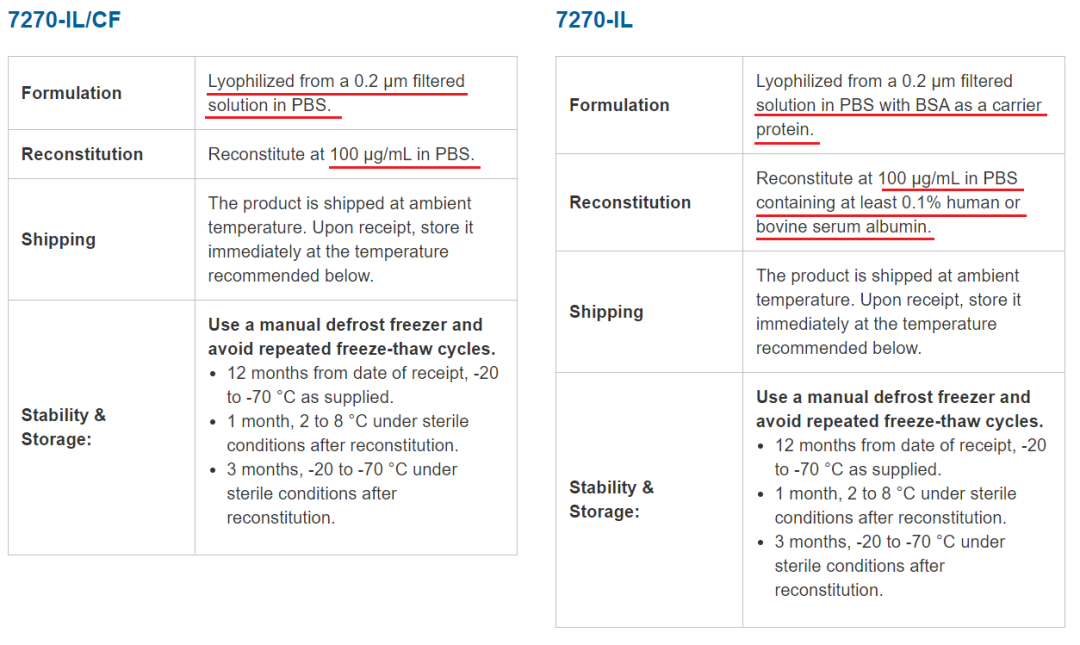 是否添加 BSA 是 CF 蛋白产品与普通蛋白产品最大的区别。这一区别使得冻干粉重溶溶液的选择以及重组蛋白的用途有所差异。