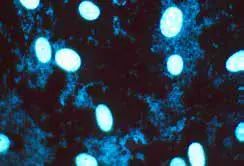 DNA检测所用的指示细胞通常是细胞质区域较大的Vero细胞,如果原样本中含有支原体,那么当细胞DNA被荧光染料(如Hoechst染料)染色时,就可以在指示细胞的核周围观察到荧光斑点或荧光颗粒;