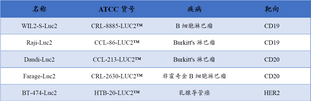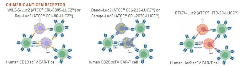 目前,ATCCT推出的CAR-T靶向荧光素酶报告细胞产品如下: